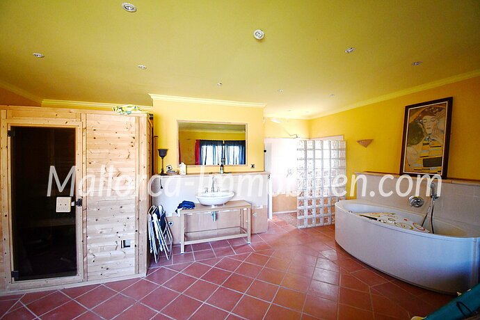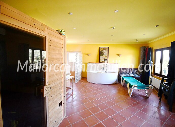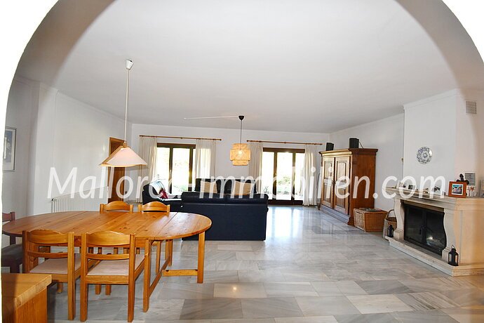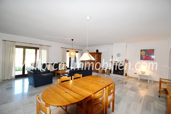 The spacious living room with its floor-to-ceiling windows facing the terrace and the open fireplace, which creates a pleasant atmosphere and cosy warmth even on cold winter days, is the heart of the house. The adjoining